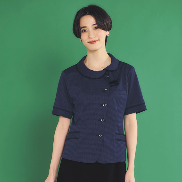 丸みのある可愛らしい衿元がエレガントな印象の上品なデザイン。衿元や袖、ポケットのライン使いなど、さりげないおしゃれにこだわった夏におすすめ事務服オーバーブラウス。