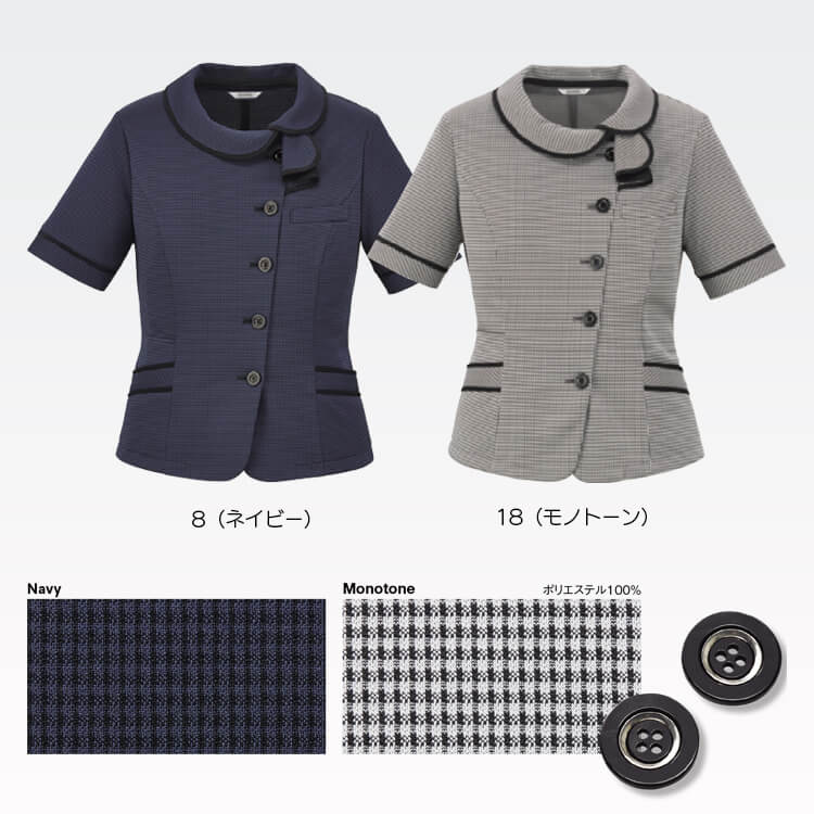 ネイビーとモノトーンの組み合わせは、落ち着いた雰囲気を演出し、どんなシーンでも活躍すること間違いなしです。サイズ展開も豊富で、5~21号まで取り揃えております。夏の会社制服としておすすめできる一枚です。プロフェッショナルな印象を与える事務服として、是非一着持っていて欲しい逸品です。