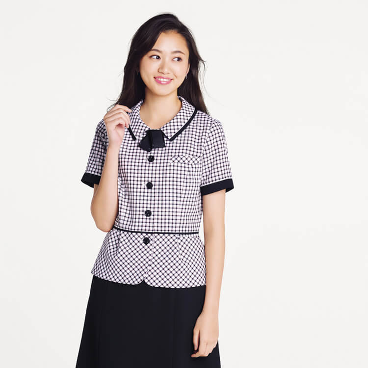 夏にピッタリな「事務服オーバーブラウス チェック柄」のご紹介です!高通気素材で快適に着られるのはもちろん、リボンは取り外し可能で2WAY仕様。さらに、消臭テープ付きでいつでも清潔感をキープ。サイズは5~21号まで幅広くご用意しています。上品なグレーと可愛らしいピンクの2色展開で、会社制服としてもおすすめです。この夏、涼しさとスタイリッシュさを兼ね備えた一枚をぜひお試しください。