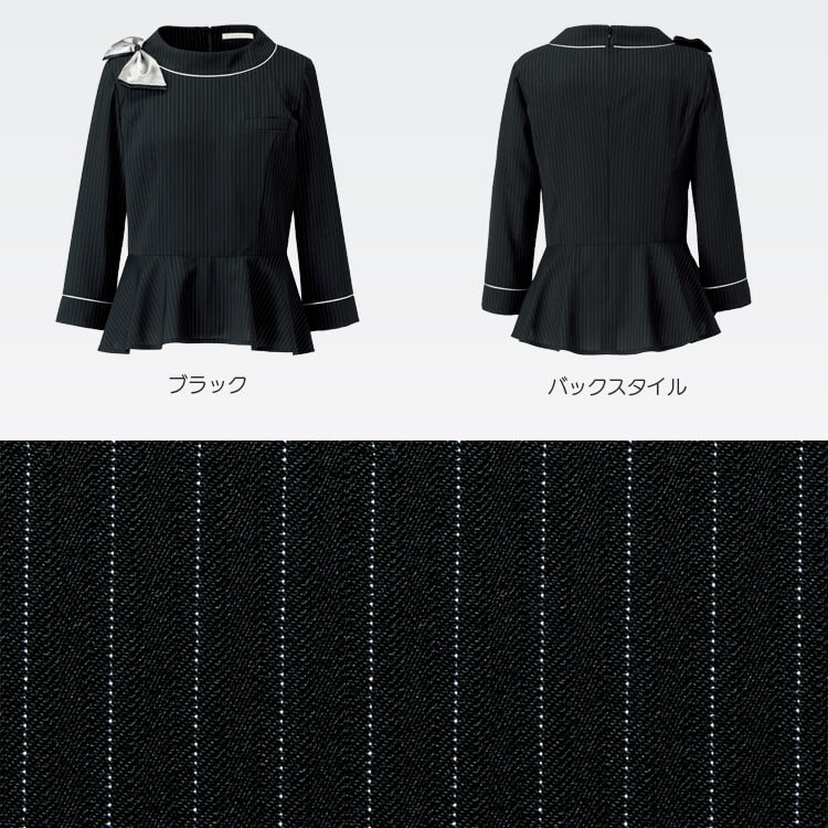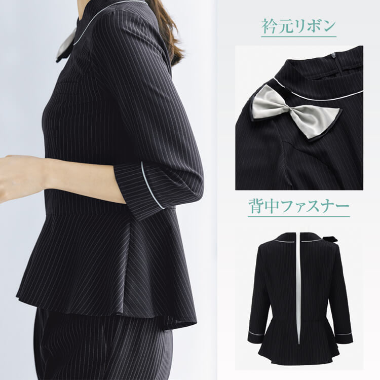 シンプルなストライプ柄のスーツをイメージしたプルオーバー制服。衿元の取外し可能なリボンとパイピングデザインにより、おしゃれ感がUPする接客業制服にもおすすめプルオーバー。