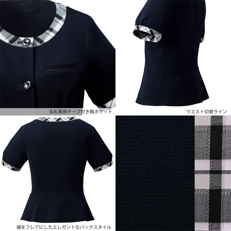 裾がフレア仕様でエレガントなオーバーブラウス半袖事務服。衿元のリボンはピンで留める仕様なので外したり、付ける位置を変えてさまざまな雰囲気を楽しめます。また背面のウエスト切り替えをウエストより少し高めの位置にすることで、よりシェイプされたシルエットです。お花カッティングを施したボタンもオシャレなアクセントになった大人可愛いオフィス制服オーバーブラウス半袖です。