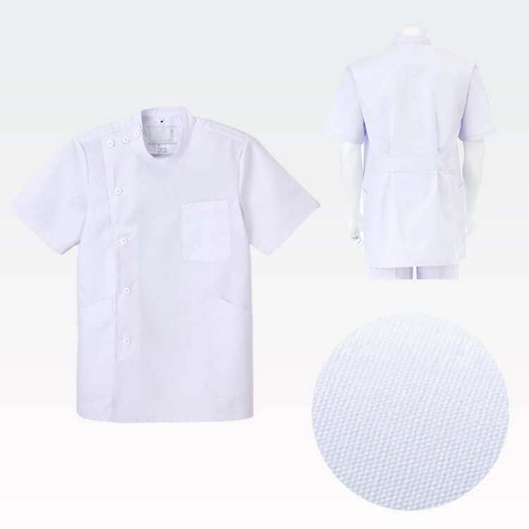 繊維上の細菌の増殖を抑制します。 特に院内感染の主原因でJTETC の定めたMRSA(メチシリン耐性黄色 ブドウ球菌)、肺炎桿菌、大腸菌、 緑膿菌などの増殖抑制の認証基準に 合格し、優れた効果を発揮する 男性用ケーシー白衣半袖。