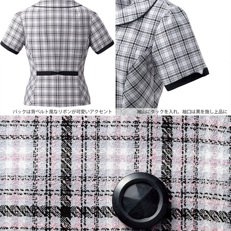 やさしい配色のチェック柄オーバーブラウス制服。肩タックと配色カフスは、袖山にタックを入れ、袖口は黒のスカラップ配色を施し上品なデザインにしました。 また動きやすいセンターベント入りで、背ベルト風のリボンが可愛いアクセントの事務服オーバーブラウス。オフィスワークでの動作を考慮した、デザイン性がありながらも毎日快適な着心地のオフィス制服「オーバーブラウス」です。