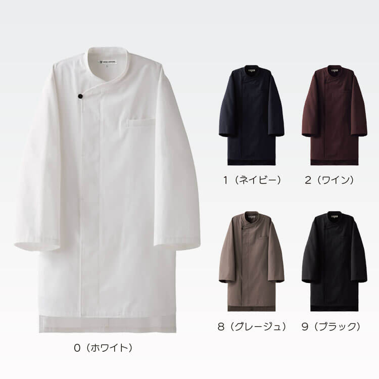 和の要素を持ちつつもモダンな雰囲気と様々に融合するコンセプト。そんなニーズに応えるべく、和に留まらず使い方によっては洋にも汎用できる新たな和シリーズの飲食店制服コート。デザインは、低めの立ち衿で比翼仕様のダブル合わせに上1つだけのボタンがワンポイントとして効いた和上衣。また着丈が長めですのでエプロン無しのコーディネートでも可能です。撥水・撥油加工が施された耐久性に富んでいながら綿風合いが豊かなツイル素材の和食店やお土産物店、店舗制服などにおすすめ和風制服です。