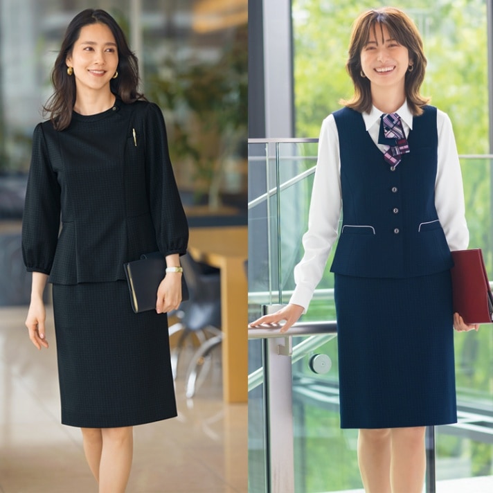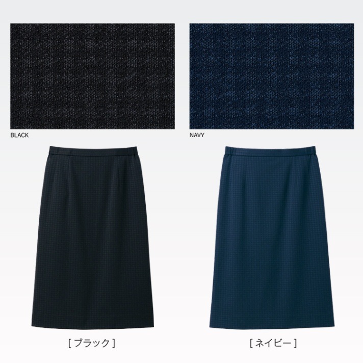 おしゃれで機能性抜群の【オフィス スカート】をご紹介します。千鳥格子柄が魅力的なこのスカート制服は、シックなブラックと深いネイビーの2色展開。オフィスユニフォームとして最適で、落ち着いた雰囲気を演出しつつも、個性を引き立てます。
