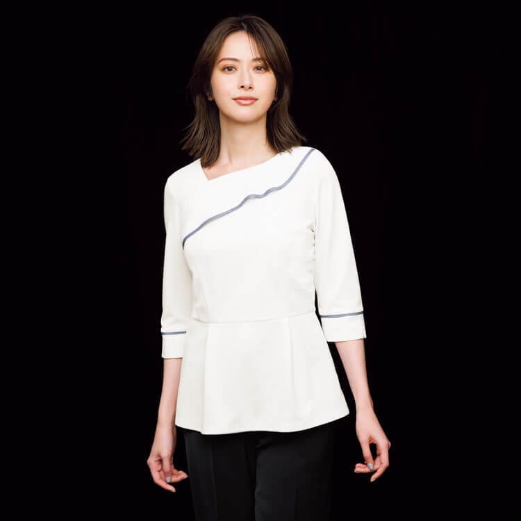 アクセサリーをつけたりスカーフを巻いたり、シンプルなデザインで、どんな装飾品とも合わせやすく、1枚で着ても様になるプルオーバー制服。接客業で求められるさまざまな業務を、より快適に行えるような機能性にもこだわり、着心地の良さと扱いやすさを叶えたエステ制服におすすめプルオーバーです。また軽快なストレッチ性があり、シワになりにくく形態回復性に優れているので、肘などの型くずれも抑えられ、美しいシルエットをキープ。またフルダル糸を使用しているので透けにくくUVカット性もある上質で光沢感が特徴のレディースユニフォームです。