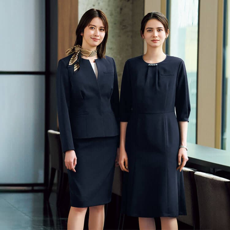 企業受付やホテル制服に最適な【事務服ワンピース】をご紹介します。2WAYストレッチ素材は、優れた伸縮性を持ち、快適な着心地を実現。吸汗速乾機能が備わっており、一日中涼しく過ごせるので、忙しい業務の合間でも安心してご着用いただけます。