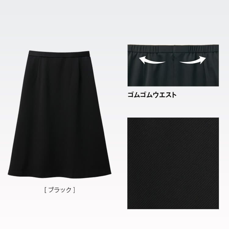 ウエストゴムデザインで、サイズに関係なくフィット感抜群です。57cm丈(9号)は、どんなシーンでも美しいシルエットを演出。接客業にも最適なブラック色なので、清潔感を保ちながらプロフェッショナルな印象を与えます。
