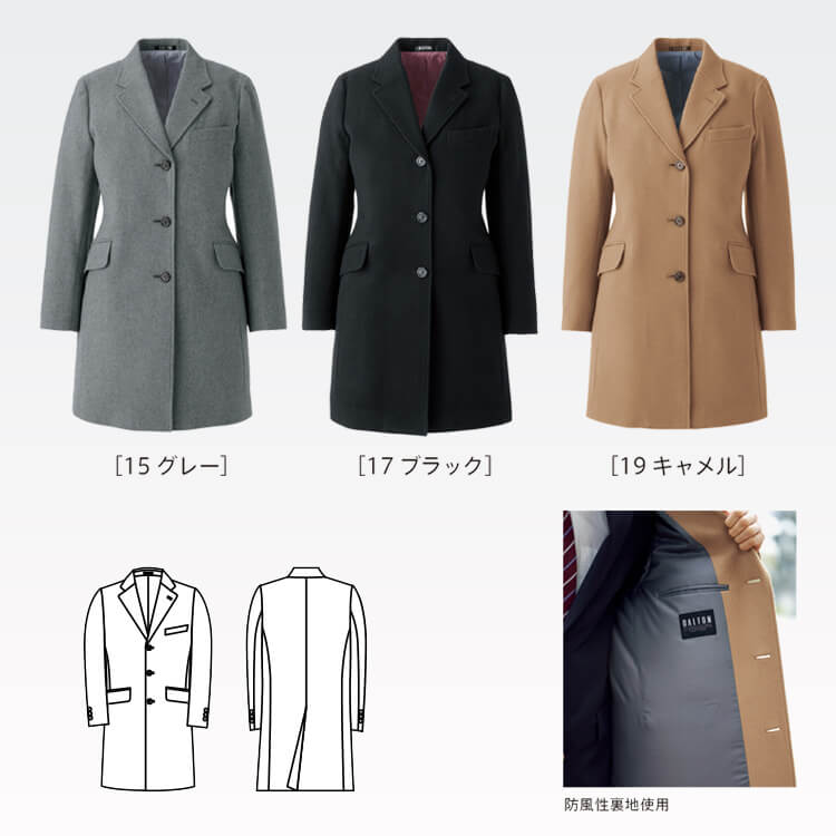 防風性裏地を使用することで、 寒風をシャットアウト。冬場の 業務をサポートする接客業用 チェスターコート。