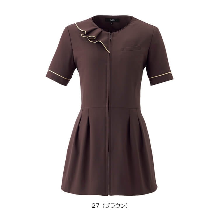 マーメイドからインスパイアされた美しいラッフルが波のように揺れる、フェミニンで遊び心あふれるデザインが魅力のエステユニフォームチュニックです。深みのあるブラウンにゴールドのアクセントが施され、エレガントで洗練された印象を与える佇まいが特徴です。滑らかでストレッチ性に優れた素材を使用しており、肌触りも抜群で、柔らかく軽やかな着心地を実現しました。また、静電気を防止する機能と吸水速乾性を備えており、長時間の着用でも快適なエステ制服チュニックジャケットです。