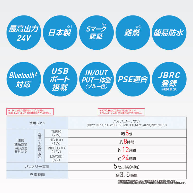 最大で24Vの出力が可能な空調風神服バッテリーRD9590PJは、Sマーク認証の取得・日本の電気用品安全法(PSE法)の基準に適合しているため、安全に使用できる業界唯一の日本製バッテリーです。 難燃性の素材を使用し、また簡易防水機能も搭載しているため多少の水濡れにも耐えることができます。標準的なType-AのUSBポートが搭載されており、空調風神服ファンだけでなく、スマートフォンやタブレットなどの様々なデバイスの充電に対応するリチウムイオンバッテリーです。