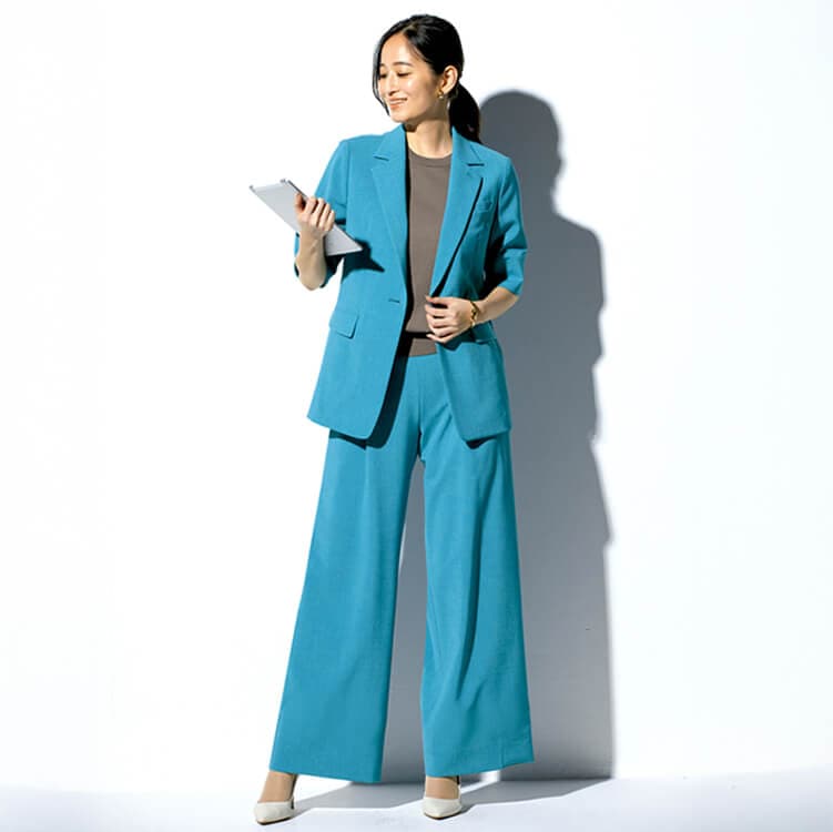 着る人の動きを妨げないストレッチ 性能で、清潔感のあるスタイルを キープしながら、快適差を提供 する夏のオフィス制服ワイドパンツ。