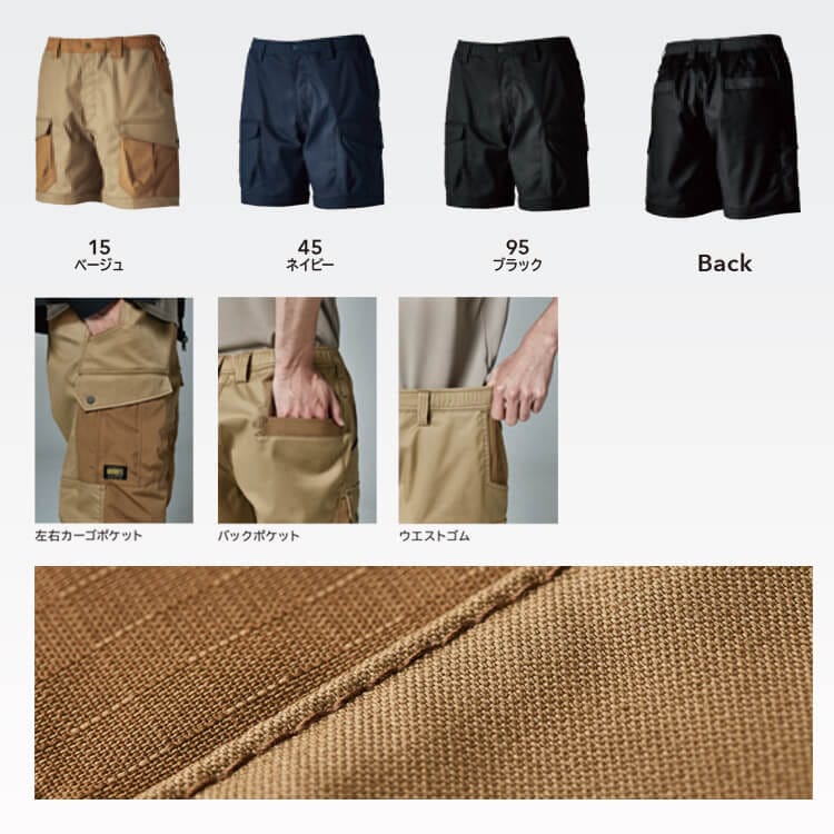 ストレッチの効いたハーフパンツ 作業服は、ハードな現場でも対応。 動きやすさを備えたデザイン。