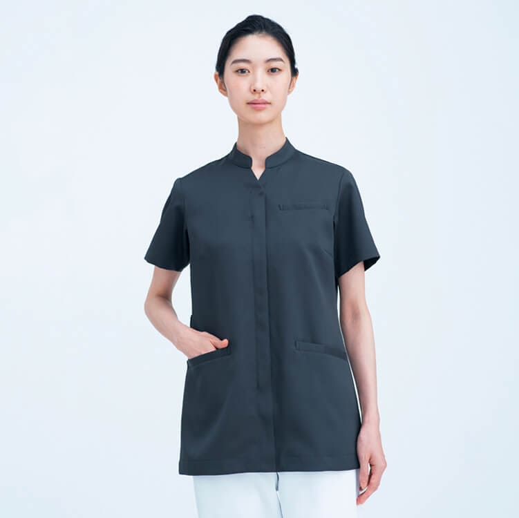 スマートな見た目と、ストレッチに よる軽やかな動きやすさを両立した ナース白衣ジャケット。