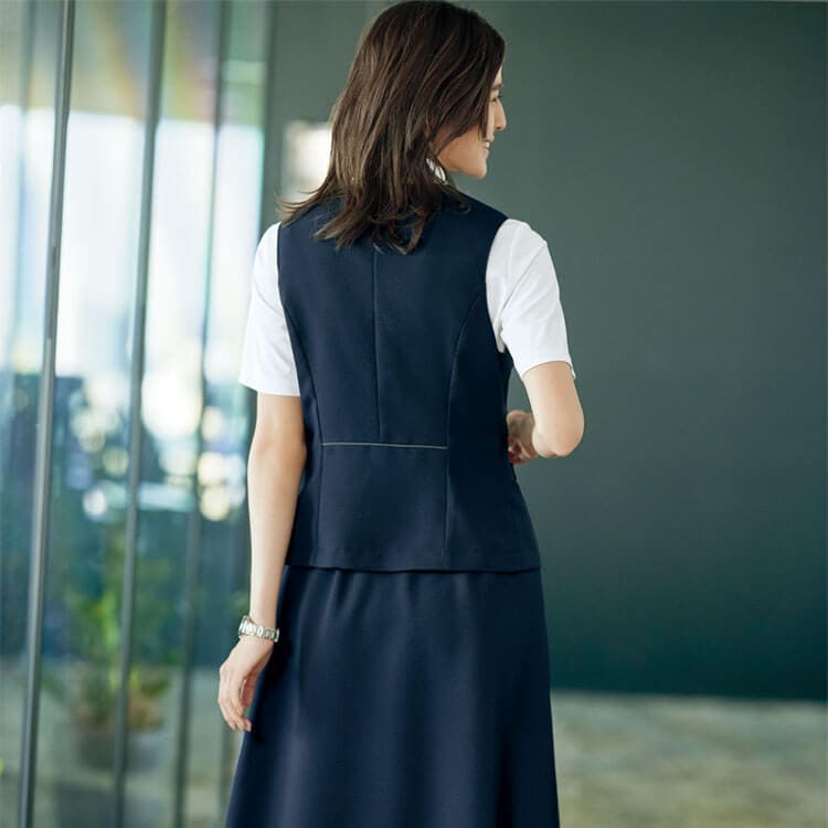 仕事中の体の動きに寄り添う伸縮 性でストレスフリーな着心地を実現 したオフィス制服夏用ベスト。