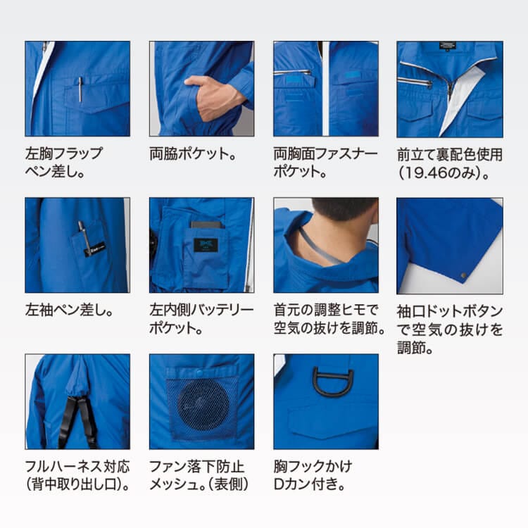 空調服フルハーネス対応・高所作業服夏用 夏用作業服半袖・ブルー・建設会社ユニフォーム