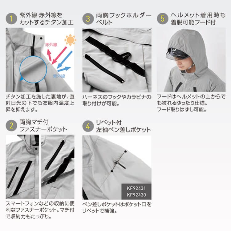 空調風神服24Vセット「フード付きブルゾン半袖&ファンバッテリー」ファン付きウェア/ 特徴