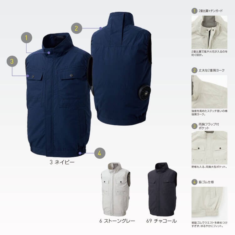 空調風神服用ベスト 綿100% 男女兼用「火に強い素材」溶接用作業着にもおすすめ/ カラー・詳細
