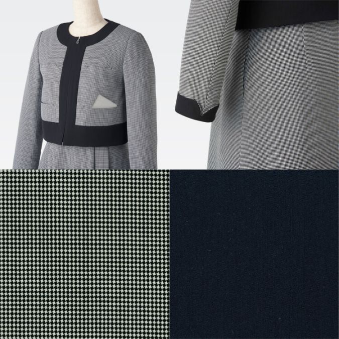 細かいチェック柄の企業受付制服ジャケットは、モダンとクラシカルの要素が融合された一着です。幾何学模様のパターンは、視覚的にリズムを与えつつも派手すぎず、洗練された印象を醸し出します。この柄は古典的な由来を持ちながらも現代にも馴染み、時代を超えたデザインとして人気の「マリークワント」オフィスユニフォーム。