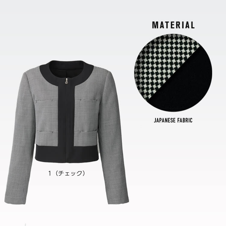 ウールとトリアセテートとよる 上質な素材感。しなやかなハリ コシのストレッチは一日中快適に 過ごせる受付制服におすすめジャケット。