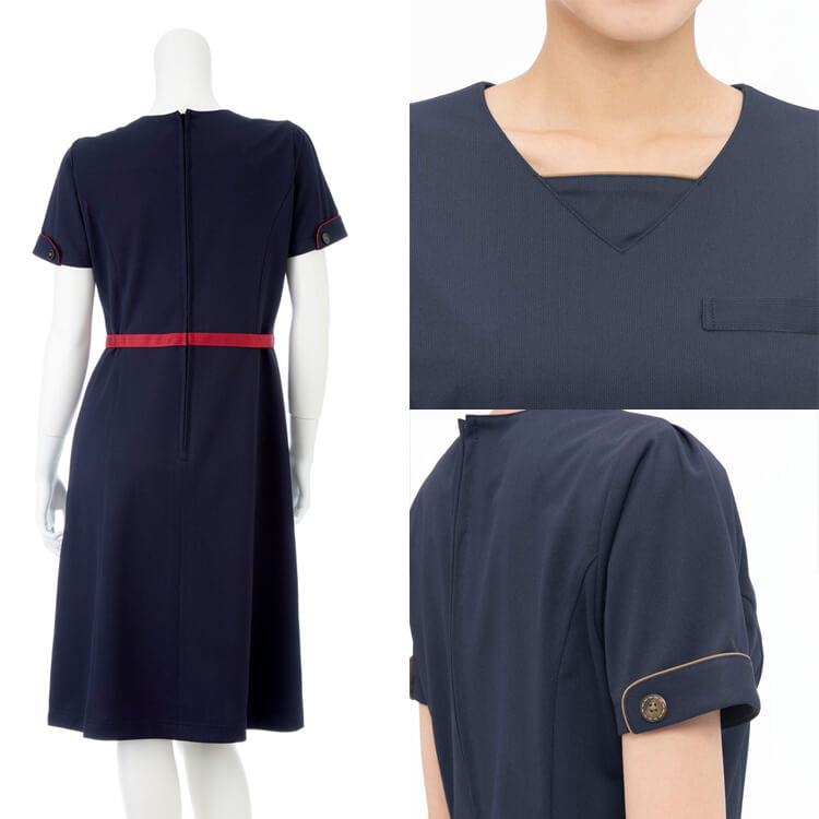 シンプルなデザインの中に上品さが光る、エステサロン制服におすすめワンピース。襟元のないすっきりとしたシルエットが、フォーマル感と清潔な印象を与えます。ウエスト部分には配色ベルトを施し、全体のバランスを引き締めるアクセントになっています。さり気ないデザインポイントが、洗練された雰囲気を演出。素材には高機能ニットを採用しており、伸縮性や通気性に優れたエステユニフォームです。