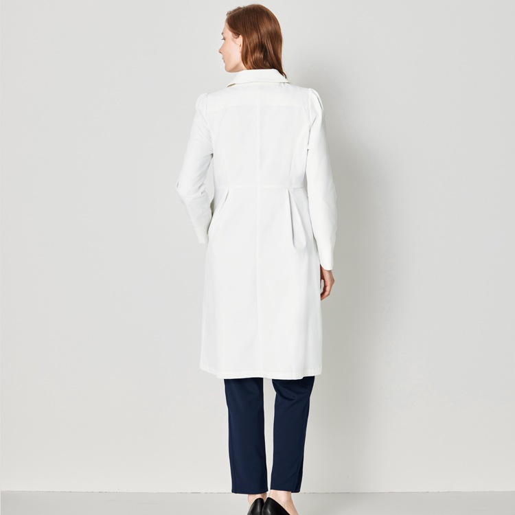 ダブルデザインが上品で存在感を引き立てるレディース用ドクターコートは、エステサロンの制服としてもおすすめの一着です。肩のふんわりとしたシルエットが女性らしいやわらかさを演出し、ウエスト切り替え部分のタック使いが美しいラインを作り出してクラシカルな印象をプラス。清潔感と高級感を兼ね備えた女性用ドクターコートです。
