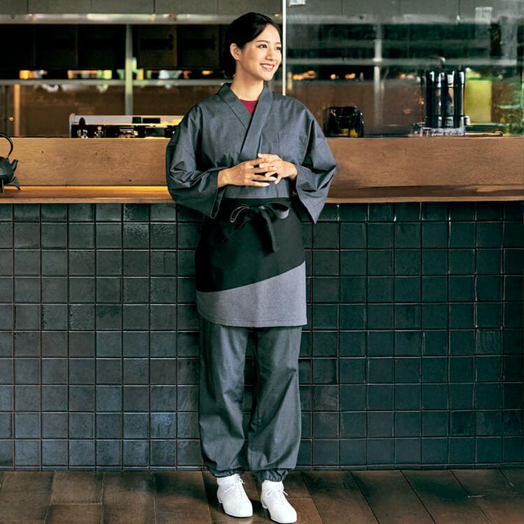 ドットエア素材が生む通気性で、 蒸れにくく、快適な着心地の 和食店におすすめ作務衣ズボン。