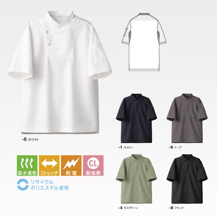Tシャツ感覚で気軽に着られる半袖ニットコート。シェフネックデザインが上品で、清潔感あるスタイルを演出します。伸縮性に優れたトリコット素材を使用し、吸水速乾・制電・耐塩素加工といった機能が作業中の快適性を支えます。袖脇下リブや裾スリット、ペン差しポケットなど、実用性に配慮した設計。ホテル厨房やレストラン、カフェなど飲食サービス業の現場に最適な半袖ユニフォームです。
