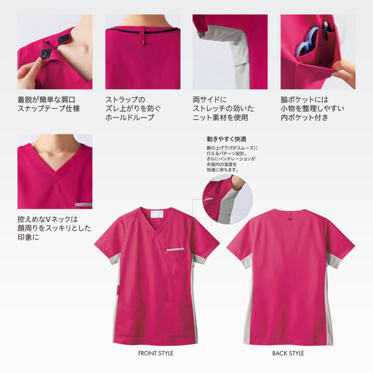 ストレッチ性と通気性に優れたデュアルファイン素材を採用した男女兼用スクラブ。汗染みが目立ちにくく、快適な着心地が持続します。サイドのニット素材が動きにフィットし、着脱しやすい肩スナップ仕様で毎日の業務をスムーズにサポートする医療用ユニフォームです。