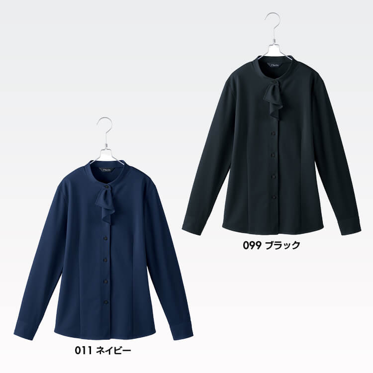 上品なスタンドカラーと華やかなフリルデザインが印象のオフィスブラウス。ネイビーとブラックの濃色展開で、清潔感ときちんと感のあるオフィスユニフォームです。オフィス制服、店舗販売員、企業受付制服などにもおすすめです。