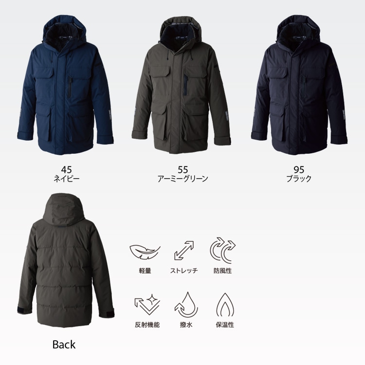 現場作業やアウトドア活動に最適な高機能素材のファイバーダウンを使用し、軽量でありながら優れた保温性を発揮します。防風ストレッチラミネート素材により冷気を遮断し、動きやすさを損なうことなく快適な着心地を提供します。また、反射機能付きのデザインで高い視認性を確保し安全性も向上させた防寒服コート。