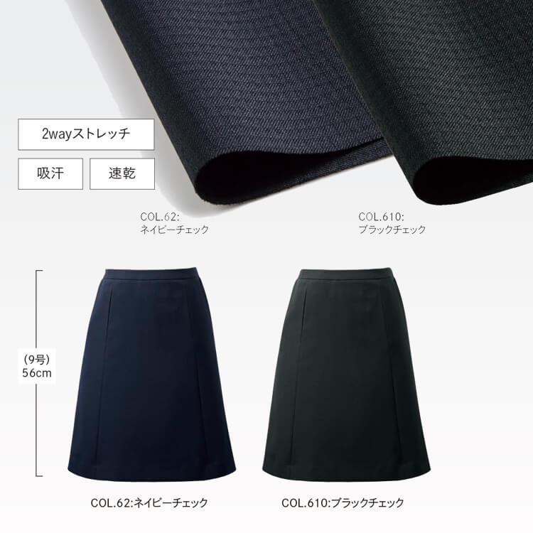 事務服や販売員制服、企業受付制服として一年中快適に着用できるAラインスカート。ニットのように伸びるシャドーチェック柄の素材は2WAYストレッチで動きやすく、吸汗速乾、イージーケア仕様で自宅洗濯も可能なオフィスユニフォームです。