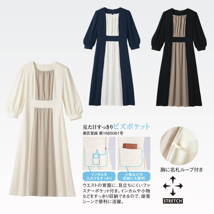 清楚なバイカラーと優美なシルエットが魅力のワンピースユニフォームは、接客シーンに品格とやさしさを添えるデザイン。高めのウエスト切替とギャザー使いでスタイルアップを叶えつつ、着心地の良いストレッチ素材で動きやすさも抜群。エステやサロン、ホテルなど、おもてなしの現場に最適な接客制服ワンピースです。