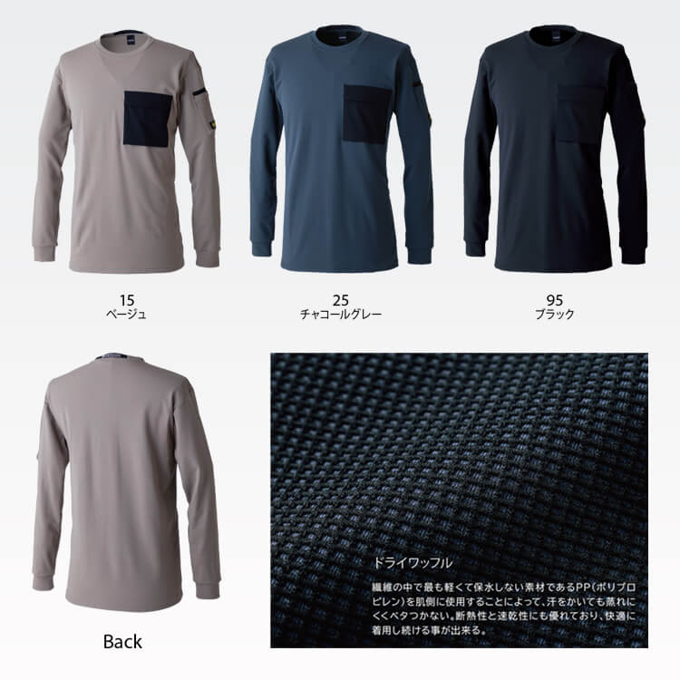 長袖Tシャツ 男女兼用「ドライワッフル」ペン差しポケット付き / 作業ユニフォーム カラー・詳細
