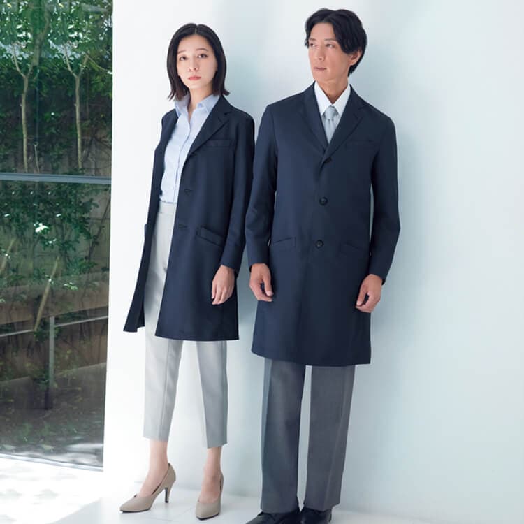 定番の白衣とは一線を画す、 洗練されたカラードクターコート。 清潔感と上品さを両立し、 医療現場に新しい印象。