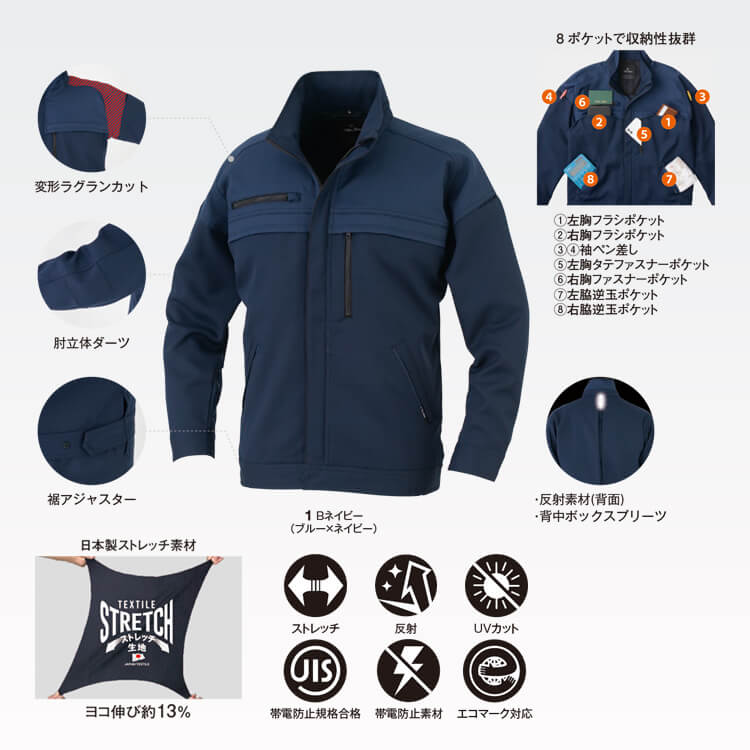 横伸約13%ストレッチ混素材で 身体や腕の動きをサポート。 アクティブな現場に対応する 作業用ジャケット。