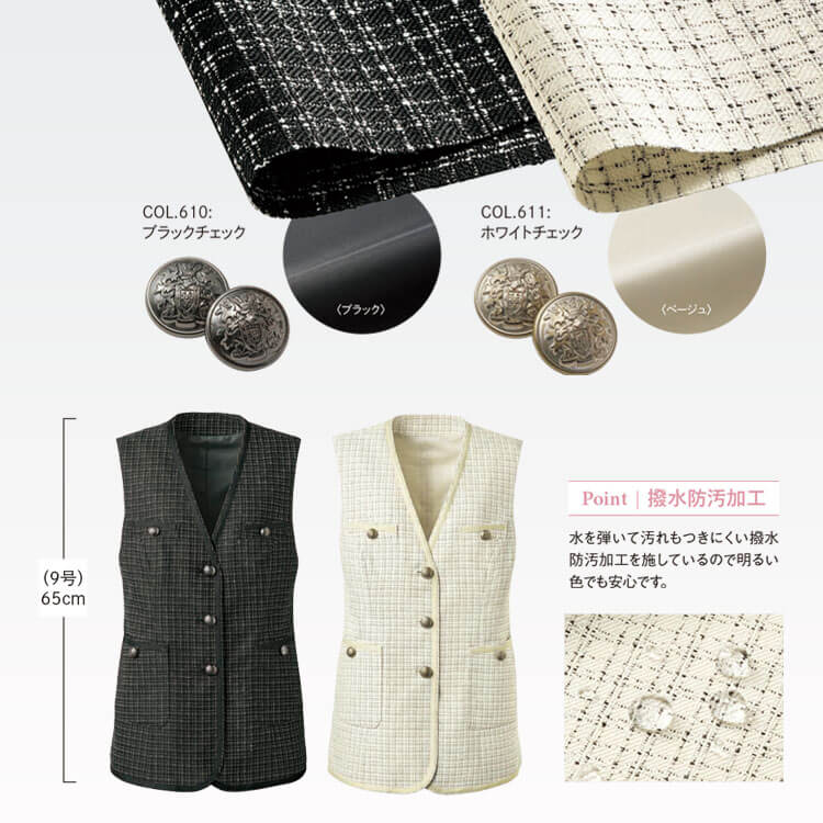 洗練された上品なツイード生地に、ウエストラインを美しく見せるシャープなシルエットが魅力のオフィス制服ベスト。ストレッチで動きやすく、撥水・防汚加工を施した事務服ロングベストです。