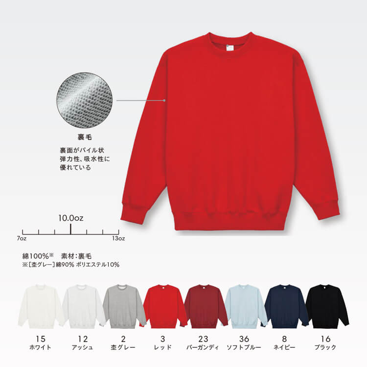 適度な厚みで型崩れしにくい 10オンススウェット素材を採用。 洗濯後もヨレにくいトレーナー ユニフォーム。